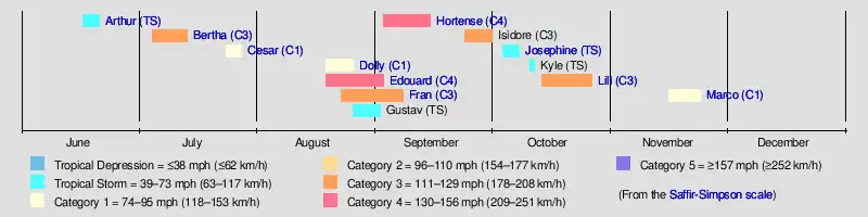 Hurricane Marco (1996)Hurricane Lili (1996)Tropical Storm Josephine (1996)Hurricane HortenseHurricane FranHurricane Edouard (1996)Hurricane Dolly (1996)Hurricane Cesar–DouglasHurricane Bertha (1996)Tropical Storm Arthur (1996)Saffir-Simpson scale