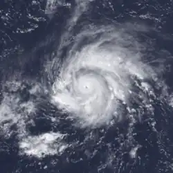 A tropical wave with a well-defined circulation developed into Tropical Depression Nine at 1200 UTC on September 24, while located south of Cape Verde. Due to an anticyclone to its north, the depression initially moved west-northwestward. After convection wrapped around the circulation and banding features increased, the National Hurricane Center upgraded the depression to Tropical Storm Isidore on September 25. Isidore deepened further and began developing an eye feature. Early on September 26, the storm was upgraded to a hurricane. About 24 hours later, it reached Category 2 intensity. At 0000 UTC on September 28, Isidore attained its peak intensity with maximum sustained winds of 115 mph (185 km/h) and a minimum barometric pressure of 960 mbar (hPa; 28.35 inHg).[60]