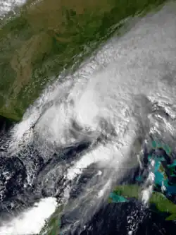 In the United States Virgin Islands, heavy rainfall and hurricane-force winds damaged about 2,500 homes, of which 43 lost their roofs. Many boats were destroyed. Total damage was estimated near $7.5 million.[26] The storm caused 3 deaths in Puerto Rico.[25] Additionally, damage in Puerto Rico totaled $7.5 million.[26] Two deaths were confirmed in Saint Martin.[25] The storm caused numerous power outages and damaged 10 homes in Antigua and Barbuda.[27] Four deaths occurred in Florida, three of which due to rip currents.[26] North Carolina bore the brunt of the hurricane in the United States. Storm surge destroyed several fishing piers, marinas, and boats. A combination of storm surge and strong winds damaged over 5,000 homes and buildings,[25] with at least 4 destroyed.[26] There were 2 deaths in the state. The remnants brought local flooding and minor wind damage to the Mid-Atlantic, New England,[25] and Atlantic Canada.[28] One surfer died in New Jersey.[25] Overall, the storm caused 12 deaths and about $285 million in damage, primarily in eastern North Carolina.[25][26]