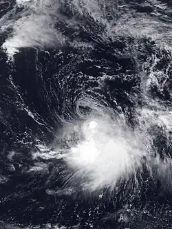 On May 15 an area of disturbed weather in the Intertropical Convergence Zone developed into a tropical depression. The disturbance was not readily traceable back to a tropical wave from the Atlantic. On its first day of its existence, Tropical Depression Two-E was a well-organized system with maximum sustained winds of 35 mph (56 km/h) and a minimum central pressure of 1,006 mbar (29.7 inHg).[15] As it slowly moved west, Two-E experienced a few intermittent bursts of convection. However, the depression gradually became less organized during the remainder of its life. On May 18, the cyclone's organization deteriorated markedly until it dissipated the next morning.