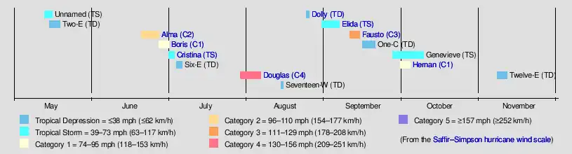 In terms of the number of storms, the season was below average. Despite this, there were a large number of landfalls. Of note is the fact that three tropical cyclones approached close to, or made landfall on, Mexico during a ten-day span from June 23 to July 3.[9] In all, a record-setting four hurricanes (Alma, Boris, Fausto, and Hernan) struck the coastline.[10]
