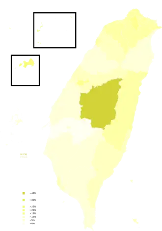 | Nantou County | 371,630 | 14,552 | 5.31% | 86,357 | 31.52% | 45,556 | 16.63% | 127,537 | 46.55% | 2,786 | 74.48% | 40,801 |