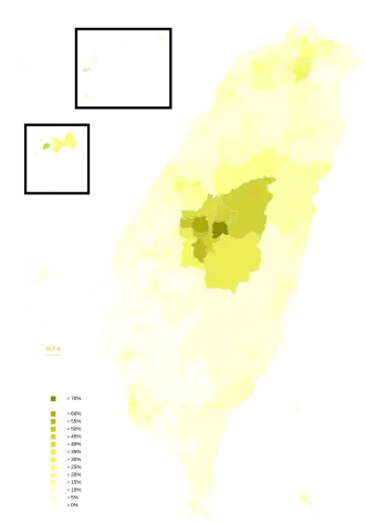 | Penghu County | 63,533 | 4,170 | 10.29% | 25,367 | 62.61% | 8,070 | 19.92% | 2,907 | 7.18% | 563 | 64.65% | 17,297 |