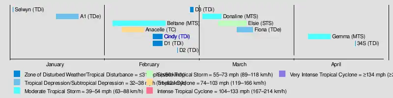 The season had the latest start in 30 years, with the first depression forming in January.[1] The first storm, Anacelle, was not named until February 8, which retains the record for the latest date of the first named storm.[4] For the early portion of the season, there were unusually quiet conditions across much of the basin, along with higher than normal pressure. The Intertropical Convergence Zone (ITCZ) associated with the monsoon only became active in February, allowing tropical cyclogenesis to occur more frequently. There were six tropical storms during the season, of which only one attained tropical cyclone status; these are below the averages of 9 and 4, respectively. No storms attained intense tropical cyclone status. The season's low activity contrasted that of the previous season, which was much more active. There were 18 days in which a storm was active, the lowest since 1982–83. An ongoing El Niño was evident during the season.[1]