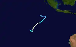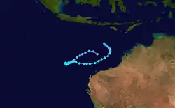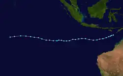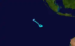 On 3 December, an area of concentrated convection developed from a monsoon trough over the Indian Ocean. The next day RSMC La Reunion issued one advisory on this system, labeling it "A3". Over the next few days the area drifted eastward into the Australian region and slowly organized. The warning center at Perth initiated bulletins on the tropical low on 7 December when the system was located 175 nm west-northwest of Cocos Island. The low remained essentially stationary for the next 48 hours while slowly weakening. Perth discontinued bulletins on the 8th, but continued to track the low for the next few days. The remnants of the low drifted eastward to a point about 150 nm north-northwest of Cocos. There is a significant possibility that this low is the same persistent one that developed into Tropical Cyclone Cathy.[2]