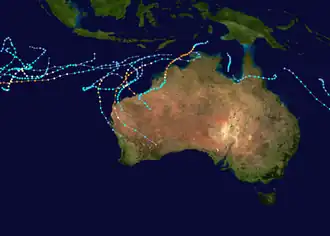 Tropical cyclones are assigned names by the Australian Bureau of Meteorology or Papua New Guinea. Tropical cyclones are named if they are non-frontal low pressure systems of synoptic scale developing over warm waters, or if Dvorak intensity analysis indicate the presence of gale force or stronger winds near the centre. Therefore, tropical systems with gales in one or more quadrants, but not near the centre, are not named.[6] All names assigned in the Australian region are selected sequentially. Only the names used during this cyclone season are listed below. The complete list of names for each basin are found in the World Meteorological Organization's official lists.[7]