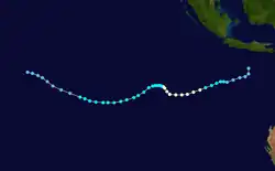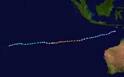 On 3 December a tropical depression formed in the Arafura Sea, 250 miles east-northeast of Darwin. The system drifted southwestward, strengthening into Tropical Cyclone Thelma on 6 December. Thelma continued to intensify as it turned to the south-southwest, reaching Category 5 strengthen on the Australian cyclone scale as it brushed the Tiwi Islands.[4] Cyclone Thelma reached a peak of 140 mph with a minimum pressure of 925 mbar on the 8th, and made landfall on the western Australian coastline on the 10th. After making landfall, the storm paralleled the coastline, and rapidly weakened to a tropical storm. Favorable conditions aloft allowed it to remain a tropical storm until the 15th, when the storm dissipated near Port Hedland. Thelma was responsible for moderate rainfall and downed trees, but caused no casualties due to the sparse population of where it hit.