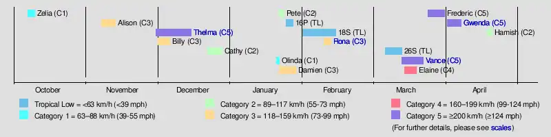 Thelma 3–15 Dec Category 5 severe tropical cyclone 220 (140) 920 Northern Territory, Western Australia None 0