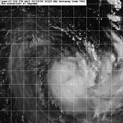 Over the next 3 days, Hali moved towards the west as it gradually intensified further, before early on March 16, an approaching upper trough of low pressure caused a weakness in the subtropical ridge.[1][10] As a result, the cyclone started to move towards the south, while the FMS reported that Hali had reached its 10-minute peak windspeeds of 120 km/h (75 mph), which made it a category 3 severe tropical cyclone on the Australian scale.[7][10] Later that day the FMS reported that the cyclone had started to rapidly weaken because of increasing vertical windshear and cooler sea surface temperatures, and interference from Tropical Depression 20F.[1][8] As a result, the FMS reported at 1200 UTC on January 18, that Hali had weakened into a depression before later that day the cyclone got caught up in the low level steering field and drifted into TCWC Wellington's area of responsibility during the next day.[11] The remnants of Hali were then last noted during March 20, as they dissipated about 1,200 km (745 mi) to the southeast of Avarua on the Southern Cook Island: Rarotonga.[7][2]