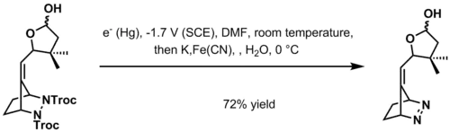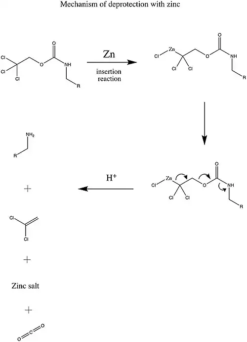 The troc group is traditionally removed via Zn insertion in the presence of acetic acid, resulting in elimination and decarboxylation.