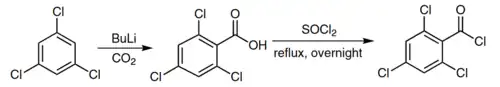 2,4,6-Trichlorobenzoyl chloride is prepared by reacting 2,4,6-trichloroaniline with n-butyllithium in a carbon dioxide atmosphere. This produces 2,4,6-trichlorobenzoic acid, which can then be refluxed in thionyl chloride to form 2,4,6-trichlorobenzoyl chloride.[4]