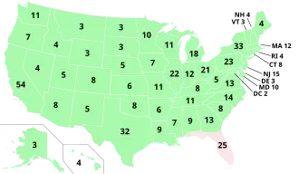 The United States Electoral College is the group of presidential electors required by the Article Two of the Constitution to form every four years for the sole purpose of electing the president and vice president. Each state appoints electors according to its legislature, equal in number to its congressional delegation (senators and representatives). Federal office holders cannot be electors. Of the current 538 electors, an absolute majority of 270 or more electoral votes is required to elect the president and vice president.[6] As stated in the Twelfth Amendment to the United States Constitution, if no candidate for either office achieves an absolute majority there, a contingent election is held by the United States House of Representatives to elect the president, and by the United States Senate to elect the vice president; under this amendment, only the election of 1824 failed to produce a majority for president, and the election of 1836 for vice president.