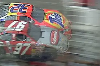 Spencer did not make a pit stop and led at the restart on lap 17, followed by Earnhardt, Nadeau, John Andretti, and Green. On the following lap, Earnhardt's new tires helped him pass Spencer for the lead going into the third turn.[30][31] Lap 23 saw the third caution:[2] Johnson made contact with Marlin, cutting the latter's tire and disabling his steering. Marlin veered into an outside barrier on the backstretch.[30] This caused a chain-reaction accident involving Labonte, Sprague, Todd Bodine, Harvick, Robby Gordon, and Raines. Harvick, Robby Gordon and Raines continued driving with aerodynamic deficiencies to their cars as Sprague, Todd Bodine, and Labonte sustained damage to their cars and were effectively eliminated from contention. Every driver, except for Jarrett and Jeff Gordon, made pit stops during the caution.[31] Jarrett led the field at the lap 29 restart.[2] On the 32nd lap, Earnhardt overtook Gordon and then Jarrett to return to the lead.[31] The fourth caution was necessitated on lap 33 when Jeff Burton in ninth position had an engine failure,[29] which obscured Stewart's vision and caused him to ram into Burton's car.[1] Jarrett and Jeff Gordon made pit stops for tires under caution.[31]