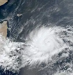 The lone system in the Arabian Sea in the season originated from a trough.[1] On November 10, an area of convection formed off the western coast of India. With little wind shear, the system organized further as it moved west-southwestward due to a ridge to the north.[21] On November 12, the system developed into a depression and quickly intensified into a deep depression.[1] That day, the JTWC classified the system as Tropical Cyclone 02A,[21] and it intensified into a cyclonic storm on November 13.[1] The storm was located at an unusually low latitude of 6° N.[2] After an eye developed in the center of the convection, the JTWC upgraded the storm to the equivalent of a minimal hurricane,[21] estimating peak winds of 150 km/h (95 mph) on November 14. By contrast, the IMD estimated peak winds of 100 km/h (60 mph),[22] making the system a severe cyclonic storm.[1] Subsequently, drier air weakened the storm, causing the convection to decrease.[21] By November 15, the storm had weakened to depression status while approaching Somalia.[1] That day, the JTWC discontinued advisories while the storm was about 520 km (320 mi) east of the Somalia coastline.[21] On November 16, the depression degenerated into a remnant low, and subsequently dissipated.[1]