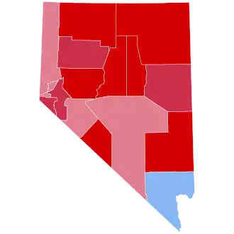 However, Bush performed strongly in Nevada's Cow Counties (its 14 counties apart from Clark, Washoe, and Carson City[6]), winning over 60% of the vote in Douglas and Lyon Counties, over 70% in Churchill County, and over 75% in Elko County (where he received the highest vote share of any nominee since William Jennings Bryan in 1896). He also did well in Nye County, another of the larger Cow Counties, getting 58.5%, an improvement of 1.8% over four years prior. And he managed to keep Clark County from being a blowout, holding Kerry to a 4.9% margin there. Together with his limiting his backslide in Washoe, this was enough to give Bush another win in Nevada. This would be the last time until 2024 that Nevada had voted Republican.