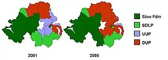 The DUP won the most out of the 2005 parliamentary elections, taking four seats from the UUP to become the largest Northern Irish political party at Westminster. Sinn Féin managed to take Newry and Armagh from the SDLP, though the SDLP did gain South Belfast from the UUP.[14]