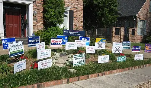 New Orleans house with a collection of signs for all the mayoral candidates, with the comment "More candidates than voters?"