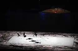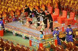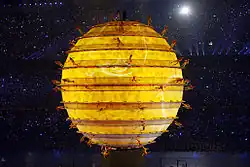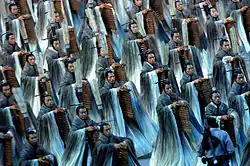 The production was overseen by acclaimed filmmaker Zhang Yimou, with choreographers Zhang Jigang and Chen Weiya serving as deputy directors, and musical direction provided by composer Chen Qigang.[7][8] The ceremony was staged on an unprecedented scale, featuring more than 15,000 performers and elaborate choreography that blended traditional Chinese motifs with modern technology. Its programme was divided into two themed sections, "Brilliant Civilization" and "Glorious Era". The first section celebrated China’s ancient contributions to world civilization, including calligraphy, movable type printing, Confucian thought, and inventions such as gunpowder and the compass. The second section shifted focus to China’s modernization in the 20th and 21st centuries, highlighting industrial progress, urban development, and the nation’s aspirations toward international cooperation and harmony.[9] One of the most memorable performances featured 2,008 drummers beating fou drums in unison, producing a monumental sound that opened the event and symbolised collective strength and unity.[10]