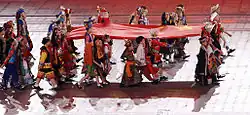 2,008 performers then held out parasols with smiling faces of young children.[40] This was followed by red and orange fireworks in the form of smiley faces. The representatives from the 56 ethnic groups danced a vigorous folk dance.