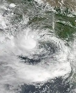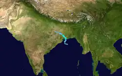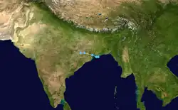 Early on September 3, the IMD reported that an area of low pressure had formed embedded within the monsoon off the Orissa coastline.[21] During the next day it developed further with the IMD reporting that the low-pressure area had become well marked with deep convection starting to consolidate around a developing low level circulation center in an area of moderate vertical wind shear.[22][23] Early on September 5, as the area of low pressure was moving into an area of low vertical windshear the JTWC issued a Tropical Cyclone Formation Alert, whilst the IMD reported that the low-pressure area had intensified into a Depression.[24][25] Later that day the IMD reported that the depression had intensified further and had become a Deep Depression, whilst the JTWC designated the depression as a Cyclone 03B, with winds equivalent to a tropical storm.[26][27] However the JTWC's first warning was also their final warning as the cyclone had made landfall near Digha in West Bengal and was expected to dissipate later that day.[27][28] However the IMD kept issuing advisories on the deep depression until early on September 7, when the IMD reported that it had weakened into a depression and then into a well marked low-pressure area later that day when they stopped issuing advisories on the depression whilst it was located over Jharkhand and adjoining region of Chhattisgarh.