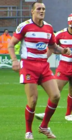 Following their knock-out at the hands of Leeds, the task of acquiring new players began. 2008 was influential stand-offTrent Barrett's last season for the Warriors, after he signed for the Cronulla Sharks for the 2009 National Rugby League (NRL) season;[14] Barrett himself insisted that Tim Smith could replace him, after Smith was released by Parramatta Eels following an episode of bipolar disorder.[15][16] It was also to be the last season for Liam Colbon and Mark Calderwood, who both transferred away from the club.[17] An attempt to sign the Canberra Raiders' Todd Carney ended after Huddersfield Giants signed him instead.[18] The club prevented a possible cross-code transfer with George Carmont to rugby union by extending his contract.[19] Wigan eventually signed their first new player with former Sydney Roosters player Amos Roberts, who was released from his contract a year prematurely,[20] but lost another player to the Warrington Wolves in Mickey Higham.[21]Joel Tomkins, a Wigan Warriors Youth Development product, also extended his contract until the end of the 2011 season.[22] Rumours about a move for Ryan McGoldrick ended after he publicly ruled out any possible transfer.[23] The question over Barrett's successor in the stand-off position was again raised when Tim Smith, who was on holiday in his native Australia at the time, approached the Cronulla Sharks seeking a return to the NRL, although the club did not pursue any deal with Smith and he therefore stayed at Wigan for the 2009 season.[24]Greg Bird, who had been suspended by Cronulla Sharks for an alleged assault on his girlfriend was also cited by The Independent as a target for the Warriors, but any plans of a transfer were initially denied by the club's chairman, Ian Lenagan.[25] On 30 January 2009, Lenagan confirmed it was unlikely there would be any more signings for the new season, having acquired two new players (Amos Roberts and Mark Riddell), after attempts to sign Richard Moore from Wakefield Trinity Wildcats failed.[26]