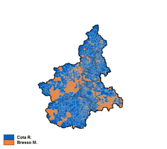 Cota, who is a republican and has no nostalgia of the House of Savoy, said his message would do well in Piedmont and that he would overcome the weakness of Lega Piemonte that usually gets far fewer votes than Liga Veneta in Veneto and Lega Lombarda in Lombardy. In Cota's view, most of his support would come from industrial workers, including those of Southern Italy descent, and Catholics embarrassed by Bresso's secularism.[5] The Union of the Centre, whose main aim in the election was to fight back the Northern League, chose to support Bresso, turning down the chance of running its own candidate, the most likely being Michele Vietti.[6] Most Catholic voters disagreed.