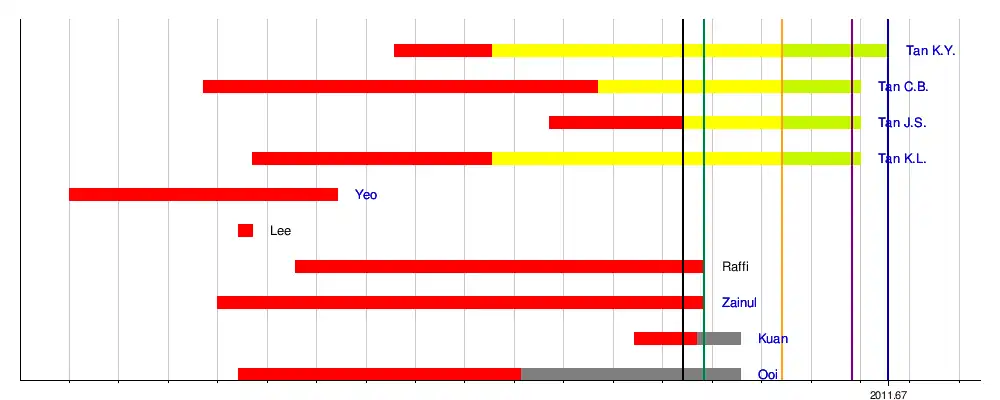 70. ^ Ye, Weiqiang (1 August 2011). "准總統參選人 4陳週末頻曝光 (Translation: The 4 "Tans" Presidential Hopeful Were Frequently Seen over the Weekend)". Shin Min Daily News. Archived from the original on 8 October 2011. Retrieved 3 August 2011.