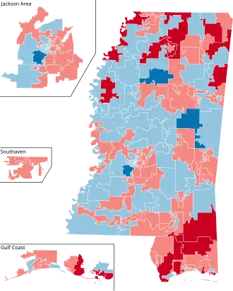 In Mississippi, Democrats controlled the House of Representatives, while Republicans controlled the governorship and gained control of the Senate early in the year due to party switching.[3] Typically, the Mississippi legislature followed the tradition of each chamber passing the others' maps without interference; however, the Republican-controlled Senate voted to reject the Democratic-passed House of Representatives map, deadlocking the redistricting process and drawing several lawsuits, including from the NAACP.[13] As the legislature showed no signs of resolving its impasse, federal courts took up the process. The NAACP sought new maps to remedy the population disparities that had grown between districts in the preceding decade, while some Republicans sought to hold the 2011 elections under the previous maps while passing new maps and holding new elections in 2012.[14] The judges ruled to conduct the elections under the previous decades' maps, agreeing that redistricting was not required to take place until 2012.[15] After the 2011 elections, the newly Republican-controlled legislature passed new legislative maps, but elections were not held again until 2015.