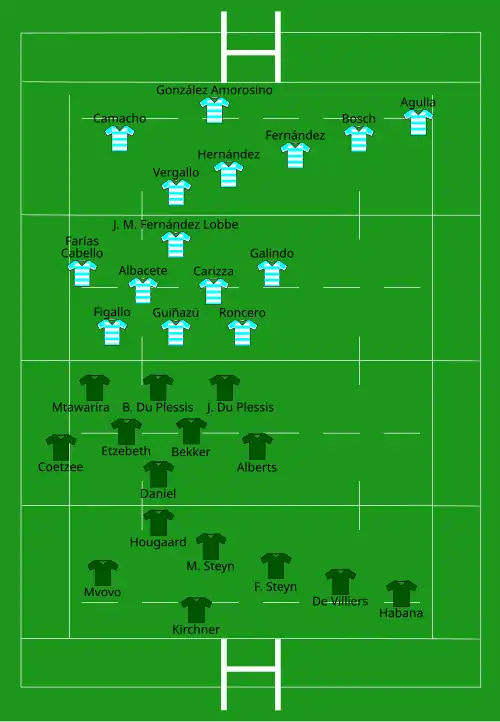 | Try: Fernández 16' c Con: Rodríguez (1/1) 17' Pen: Rodríguez (3/5) 11', 35', 50' | Report[12] | Try: F. Steyn 64' c Con: M. Steyn (1/1) 65' Pen: M. Steyn (3/7) 32', 48', 53' |