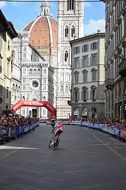 Tickets for crucial points of the course in Florence and Fiesole could be bought in advance. Ticket prices ranged from 20 Euro to 100 Euro for seating near the finish line of the men's road race.[3] Related to the Championships, many events were organized including expositions, exhibitions, a cyclosportive, and the Bicycle Film Festival.[4] Poste italiane made a stamp dedicated to the Championships in 3.290,000 pieces and Chianti Classico produced wine bottles with special Championships labels.[5][6]