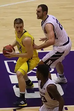 On December 2, Michigan defeated Syracuse in an ACC-Big Ten Challenge game that went down to the wire. After blowing a 10-point second half lead Michigan needed a three point shot from Albrecht with 31 seconds remaining for the victory.[84][85] On December 6, Michigan suffered its first home loss of the season to the New Jersey Institute of Technology by a 72–70 margin, despite a career-high 32 points by Levert. With the loss, Michigan's 30-game home win streak versus unranked opponents was snapped. NJIT shot 11-for-17 on its three-point shots in the game.[86][87] The team lost its three subsequent games to Eastern Michigan,[88] (#3)[89] Arizona,[90] and SMU.[91] The loss to Eastern Michigan, which is separated from the University of Michigan by a 6-mile stretch of Washtenaw Avenue, ended a Big Ten-high 59-game streak without consecutive losses.[88] Eastern Michigan was led in assists (6) by Michael Talley,[88] son of Michigan Basketball point guard and alum Michael Talley Jr.[92] The December 9 80–53 loss to #3 ranked Arizona was one point shy of being the largest defeat of the Beilein era.[93] The December 20 SMU game marked the first career start by Ricky Doyle.[94] On December 22, the team snapped its 4-game losing streak with a victory over Coppin State who was coached by Michael Grant, the brother of former Wolverine and Big Ten Conference Men's Basketball Player of the Year Gary Grant. One of the game's big storylines was the first regular season point by Austin Hatch.[95][96] Doyle's game-high 16 points marked the first time he led the team in scoring.[97] Michigan won its Big Ten Conference home opener against Illinois in overtime on December 30 on the day it announced Jim Harbaugh would become the new Michigan Wolverines football head coach. Aubrey Dawkins, who had a career total of 15 points entering the game, scored a game-high 20-points.[98]