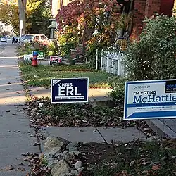 The 2014 Hamilton municipal election was a municipal election that occurred on October 27, 2014,[1] to select one mayor, fifteen members of the Hamilton City Council and members of both English and French Public and Catholic School Boards.[2] As per the Ontario Municipal Elections Act, nominations opened on January 2, 2014, and closed on September 12, 2014.[3] Four new councillors were elected in open seats across Hamilton while all incumbents who stood for re-election had returned to office. Though marked by a steep decline in voter turnout, this election was historic, as it saw the election of Hamilton's first openly gay and first radicalized members of city council.[4]