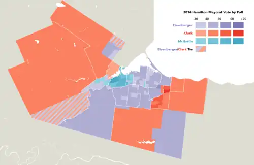 The winners in each poll for the 2014 Hamilton Mayoral election with successful candidates in each polling division graphically represented by a gradient indicating the level of the vote with which they won.