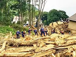 An estimated 2,000[27]–3,600[28] rescuers consisting of firefighters, police and members of the Self-Defense Force took part in searching and clearing debris despite rain and dangerous conditions that hampered and sometimes halted their efforts. There was also ongoing risk for a secondary disaster, and more rain was forecast for the area.[29][b] Consequently, residents on Asakita and Asaminami were told to evacuate.[30] Because schools were being used as shelters, several had to postpone the start dates.[31] All elementary school shelters were closed 1 November.[32]