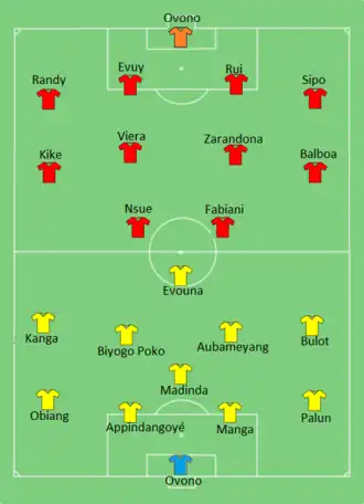 Equatorial Guinea took the lead in the 55th minute through Javier Balboa's penalty, awarded after he was brought down by Lloyd Palun. They sealed the win in the 86th minute, as Ibán converted the rebound after Emilio Nsue's shot was saved, confirming their qualification to the knockout stage and eliminating Gabon.[14][15]