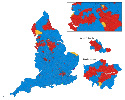 ![]() A map of English parliamentary constituencies *Seat figure does not include the Speaker of the House of Commons, John Bercow, who was included in the Conservative seat total by some media outlets. | |||||||||||||||||||||||||||||||||||||||||||||||||