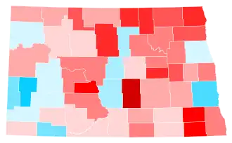 North Dakota shifted rightward by 16.11%, marking the strongest rightward shift made by any state in 2016. However, in terms of individual electoral votes, Maine's 2nd congressional district saw a stronger rightward shift of 18.85%. This highlighted the strong rightward shift among white working class voters, particularly in rural areas in Northern states.[6]