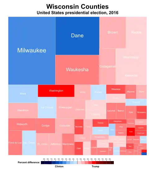 The only counties in the state to swing leftward were the three most college-educated counties in the state (see the map), namely Dane (home to the University of Wisconsin-Madison), and the WOW counties of Waukesha and Ozaukee. The other WOW county of Washington County and Milwaukee County only narrowly shifted rightward. These swings were insufficient to prevent Trump from flipping the state, but they were enough to keep the state's margin of victory under 1%.[23]