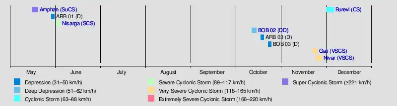 The season began on May 16 with the designation of Depression BOB 01 in the Bay of Bengal, which later became Cyclone Amphan, the strongest storm in the Bay of Bengal recorded since the 1999 Odisha cyclone and breaking the record of Cyclone Nargis of 2008 as the costliest storm ever recorded in the basin. Two more cyclones formed in the Arabian Sea, ARB 01, affecting Yemen and Oman, and Cyclone Nisarga, which made landfall in Maharashtra. After a four-month pause of activity, BOB 02 formed, causing 98 fatalities. Its remnants formed ARB 03. It was a weak storm. After 2 days, BOB 03 formed, impacting and affecting West Bengal, Bangladesh and Northeast India. It was also a weak storm, lasting for 2 days. After its break, Cyclone Gati formed, leaving 8 confirmed, 30 missing as of today, on Somalia and Yemen, where the cyclone took place. On November 23, a depression formed in the Bay of Bengal, and it strengthened into Very Severe Cyclonic Storm Nivar, two days later. It made landfall between Puducherry and Chennai close to Mahabalipuram in the midnight of November 25. It weakened into a well marked low pressure in the early hours of November 27. On November 28, a low pressure formed off the coast of Tamil Nadu, it gradually intensified into a depression, BOB 05. It later intensified into a deep depression and then into a cyclonic storm, named Cyclone Burevi. It made landfall on Sri Lanka as a weak cyclonic storm before it degenerated to an area of low pressure.
