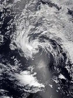 A tropical wave emerged off the west coast of Africa on June 20 and crossed into the East Pacific on July 3, where it interacted with the monsoon trough and began to organize. This system developed a defined surface low on July 6 and was classified as a tropical depression about 435 mi (700 km) south of Acapulco, Guerrero. Steered along a northwest trajectory by a mid-level ridge, the depression traversed a region of favorable conditions which enabled slow intensification.[28] Initial predictions from the NHC suggested significant strengthening of the cyclone.[29] However, Cristina instead encountered cooler waters and eventually drier air; it reached its peak intensity late on July 10 with winds of 70 mph (110 km/h) as it passed west of Socorro Island. Thereafter, the cyclone turned west along the south side of the subtropical ridge and steady weakened. The storm degraded into a remnant low around 18:00 UTC on July 12 and degenerated into a trough on July 15 about halfway between Hawaii and Baja California Sur.[28]