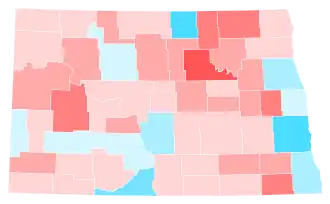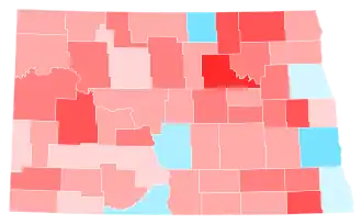 Trump easily won North Dakota 65.1% to 31.8%, a margin of 33.34%, about three points down from his 36-point victory in 2016. Joe Biden won the same two counties Walter Mondale, Al Gore and Hillary Clinton won in 1984, 2000 and 2016 respectively: the majority-Native American counties of Rolette and Sioux, both of which have long been Democratic strongholds. However, Biden only came 2.7 points short of winning Cass County, which holds the state's largest city of Fargo, as compared to Clinton's 10.5-point loss in 2016.