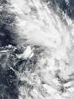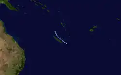 On February 4, the United States Joint Typhoon Warning Center reported that a tropical disturbance had developed within the Australian region about 1,285 km (800 mi) to the west of New Caledonia.[31] The disturbance was starting to develop a low-level circulation, which was accompanied by fragmented atmospheric convection, along a frontal boundary that extended across the Cape York Peninsula and the Coral Sea.[31] Over the next couple of days, the Australian Bureau of Meteorology (BoM) and the Fiji Meteorological Service (FMS) started to monitor the poorly organized system as Tropical Low 18U and Tropical Disturbance 08F, as it moved eastwards within the frontal boundary towards Vanuatu and the South Pacific basin.[32][33][34] During February 7, the system started to slowly consolidate, as it passed to the north of New Caledonia, before the FMS classified the system as a tropical depression.[35][36] At this stage, the depression was moving eastwards and was predicted to continue to move eastwards towards Fiji, however, the depression slowed down as it approached the islands of southern Vanuatu during February 8.