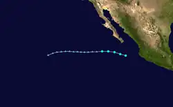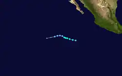 On July 26, the NHC noted a disturbance located about 700 miles (1,125 km) south-southwest of the southern tip of Baja California. The system moved parallel to another disturbance which later became Hurricane Hilda.[50] By 21:00 UTC on July 30, the disturbance attained a well-defined center of circulation with sufficient organized convection and was classified as a tropical depression, bearing the designation Nine-E.[51] The depression was initially forecast to become a tropical storm, but failed to do so due to dry air and wind shear caused by nearby Hurricane Hilda. Early on August 1, the system degenerated into a remnant low.[52] Even though Nine-E was a tropical low, the NHC still monitored the system for further development[53] On August 4, it re-intensified into a tropical depression again while maintaining two rainbands in a slightly elongated circulation.[54] On the next day, at 09:00 UTC, the depression intensified into a tropical storm, with the NHC naming it as Jimena, as the storm's deep convection had increased near the low-level center and based on satellite imagery, the storm was producing tropical storm force winds.[55] The convection later diminished on August 6, as it moved over cooler sea-surface temperatures and encountering high wind shear and dry airmass. However, despite all this, Jimena managed its intensity, as it continued to produce tropical storm force winds, based on ASCAT data.[56] A deep convective mass also continued to persist over the center of Jimena.[57] At 21:00 UTC, the NHC issued its last advisory, downgrading the system to a tropical depression as it entered the CPHC's area of responsibility. Its deep convection weakened significantly as it moved over cool sea surface temperatures causing Jimena to weaken.[58] The CPHC later issued its only bulletin for Jimena at 03:00 UTC the next day, stating that Jimena had become a post-tropical cyclone as its deep convection had collapsed completely.[59]