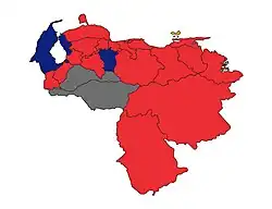 On election day, violence was reported in the Zulia state, including a polling center where colectivos fired upon. In total two people were killed and others were injured.[11] The Office of the United Nations High Commissioner for Human Rights expressed its concern about the reports.[12] The results announced that the ruling PSUV won governorships in at least 18 of the 23 states. The announced turnout was 42.2%.[13]