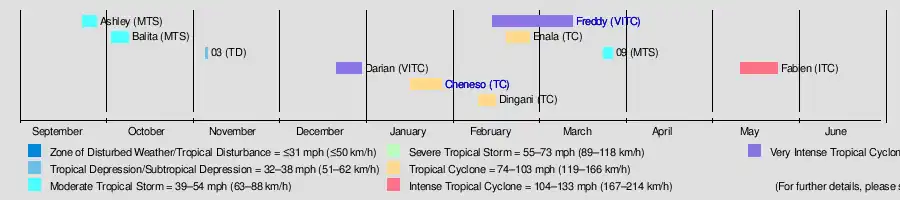 The season began early, with a weak tropical low being produced on 22 September.[3] Improving conditions over the next three days allowed the development of the system, which strengthened into Moderate Tropical Storm Ashley on 27 September.[4][5] The system slowly moved westward and weakened into a remnant low on 30 September.[6] Pre-season activity continued, with a disturbance being produced as a result of a westerly wind burst.[7][8] Another storm formed on 6 October, and was named Balita on 8 October.[9] In November 2022, Tropical Low 02U (reclassified the system as Tropical Depression 03) entered the basin and degenerated into a remnant low by the next day.[10][11] In December, Cyclone Darian (classified as a very intense tropical cyclone) entered the basin, before gradually weakening.[12]