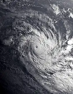 Multispectral animated satellite imagery revealed a 8 nautical miles (15 km; 9.2 mi) surrounded eye around deep convection as a result, the cyclone weakened to Category 2-equivalent cyclone.[45] Further weakening occurred as the MFR assessed that Darian's winds bottomed out at 155 km/h (100 mph).[46] At 03:00 UTC on 26 December, the JTWC reported that Darian had re-strengthened to 205 km/h (125 mph) with a warm 14 °F (−10 °C), a wide eye 25 nautical miles (46 km; 29 mi), and was surrounded by cold, −98 to −116 °F (−72 to −82 °C) cloud tops.[47] Using the Dvorak technique, MFR estimated winds of 185 km/h (115 mph).[48][49] Due to moderate east-northeasterly vertical wind shear, Darian fell to 155 km/h (100 mph) winds, according to MFR.[50] Just six hours later, the eye feature persisted, consisting of a warm area within the cooling eyewall.[51] At 15:00 UTC on 27 December, the JTWC further downgraded it to a Category 1-equivalent cyclone.[52] Satellite imagery showed that the cloud pattern began to rapidly deteriorate, and MFR followed suit and declared it a severe tropical storm.[53] The JTWC also reported that Darian's weakened into a tropical storm.[54] By 00:00 UTC on 29 December, Darian weakened into a moderate tropical storm, after the convection diminished around the center.[55] MFR issued its last advisory on the storm on 30 December as it transitioned into a post-tropical depression.[56] The JTWC also discontinued warnings on the system around 03:00 UTC on 31 December.[57]