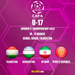 the 2023 CAFA U-17 Women's Championship was second edition of the CAFA U-17 Women's Championship, the biennial international women's youth football championship organised by Central Asian Football Association (CAFA) for the women's under-17 national teams of Central Asia. It took place in Hisor, Tajikistan.[1][2] A total of four teams including host Tajikistan participated in the tournament, with Kyrgyz Republic debuting in the tournament.