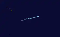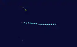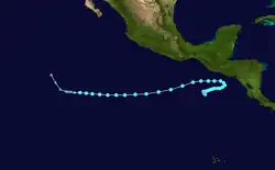 Although the season officially began on May 15 in the Eastern Pacific, and on June 1 in the Central Pacific,[15] its first several weeks were quiet, as the first system, Hurricane Adrian, did not develop until June 27. Typically, the first named storm forms around June 10.[16] Two days later, as Adrian moved out into the open Pacific, Hurricane Beatriz formed near and tracked parallel to the Mexican coast.[17] Next came Hurricane Calvin, which formed off the southwestern coast of Mexico during the second week of July and became the first major hurricane of the season as it moved steadily west-northwestward toward Hawaii.[18] Hurricane Dora ushered in August, rapidly intensifying into a Category 4 hurricane, while tracking towards Hawaii.[19] On August 11, Dora crossed the International Dateline, becoming the second tropical cyclone on record to be at hurricane strength in the Eastern, Central and Western Pacific basins, the other being John in 1994.[20] Additionally, Dora maintained Category 4 intensity longer than any Pacific hurricane on record.[nb 3][21]