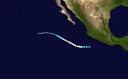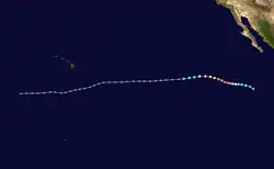 Forecasts at the outset of the 2023 season predicted busier-than-normal tropical cyclone activity in the eastern Pacific basin, largely due to El Niño.[6] However, no tropical cyclones developed until June 27, when Hurricane Adrian initially formed, becoming the latest first-named Eastern Pacific tropical storm since Tropical Storm Agatha in 2016.[7] In July, Hurricane Calvin became the season's first major hurricane, later passing just south of the Big Island of Hawaii as a tropical storm, bringing widespread rainfall to the area and neighboring Maui. In August, Category 4 Hurricane Dora passed south of the Hawaiian Islands and contributed to strong gradient winds over Hawaii, which in turn helped fan the flames of multiple devastating wildfires.[3] Later that month, Hurricane Hilary made landfall as a tropical storm in Baja California, later bringing torrential rainfall and gusty winds to the Southwestern United States. In early September, Hurricane Jova, the first Category 5 hurricane in the basin since 2018, caused rainfall, high waves and rip currents in areas previously affected by Hilary.