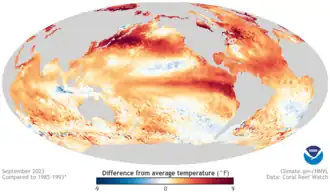 Map of sea surface temperature (SST) anomalies in the Pacific Ocean in September 2023, showing well above-normal SSTs east of the International Date Line (180°)